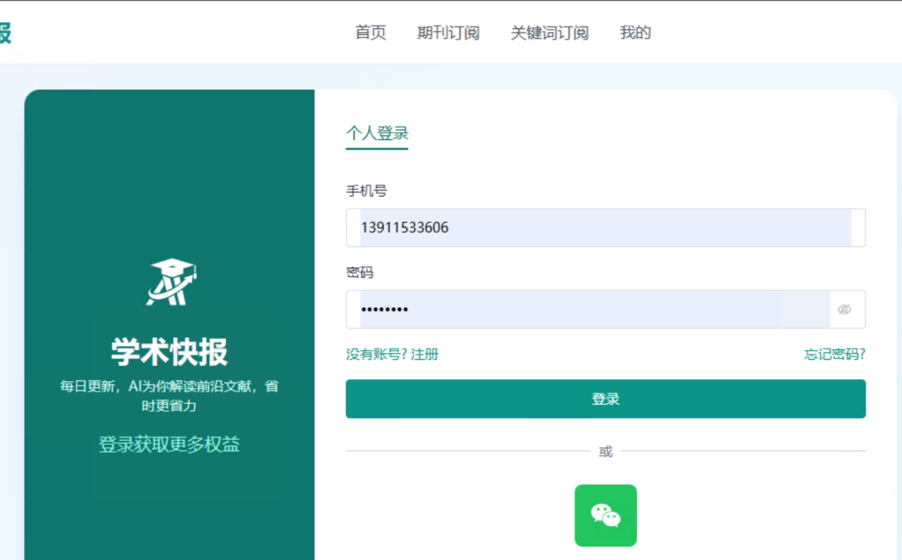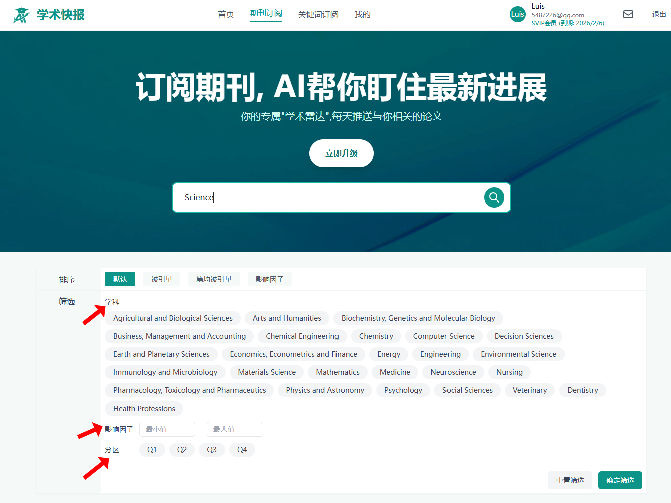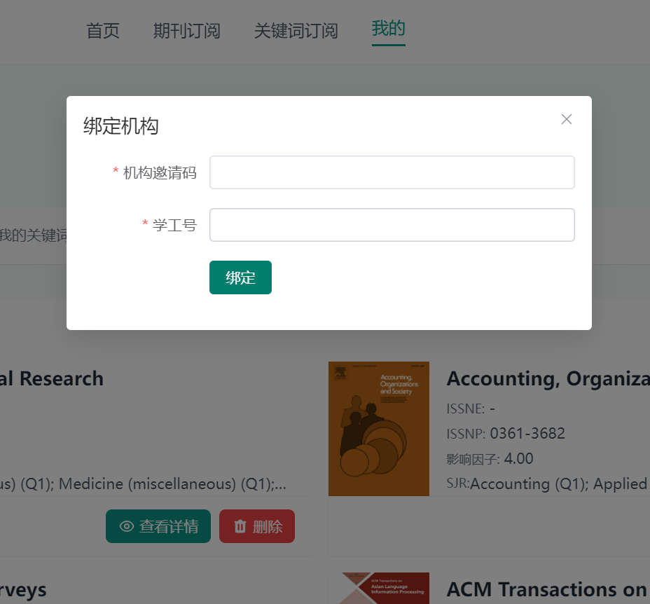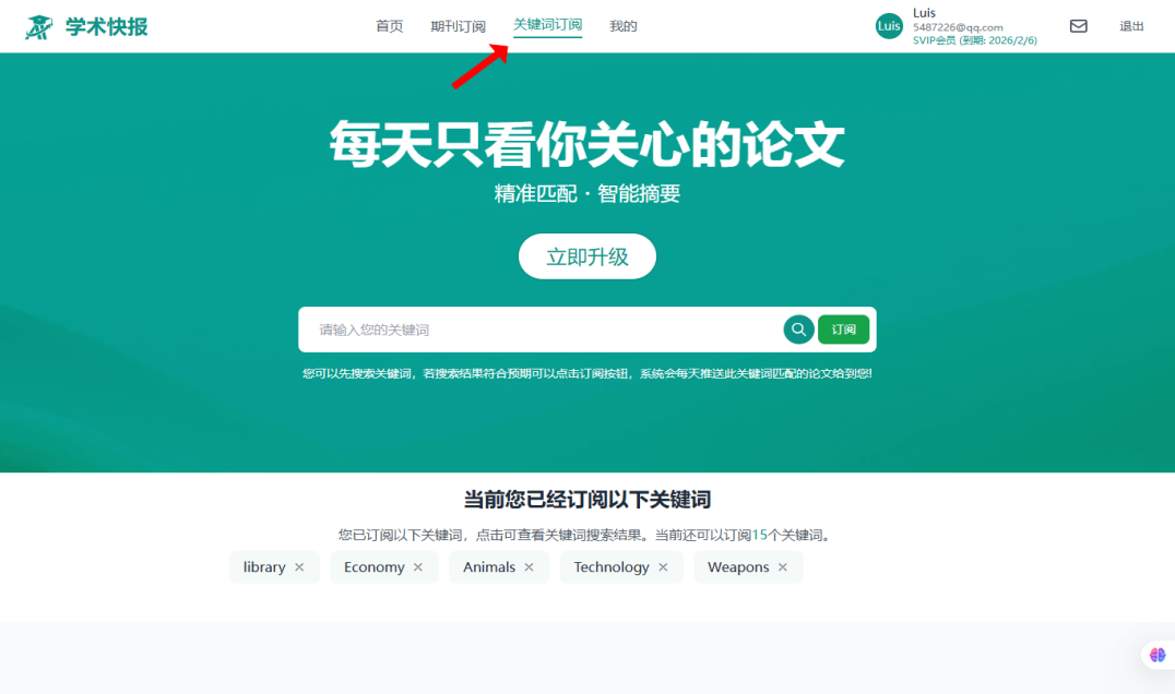 点击页面“关键词订阅”您可以先搜索关键词,若搜索结果符合预期可以点击订阅按钮,系统会每天推送此关键词匹配的论文到邮箱。