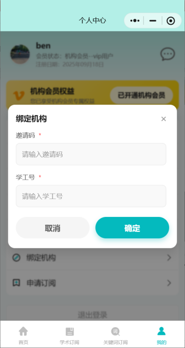 1.小程序端扫码登录完成后可点击绑定机构,输入邀请码和学工号可注册为机构用户。